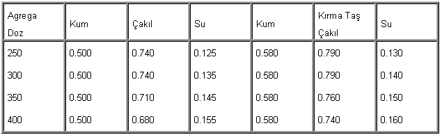 agrega ve su miktarları hacmen